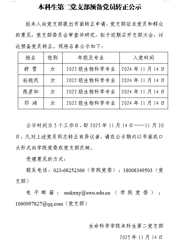本科生第二党支部预备党员转正公示