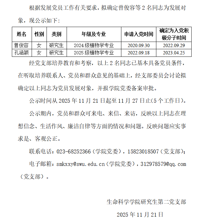 研究生第二党支部党员发展对象公示